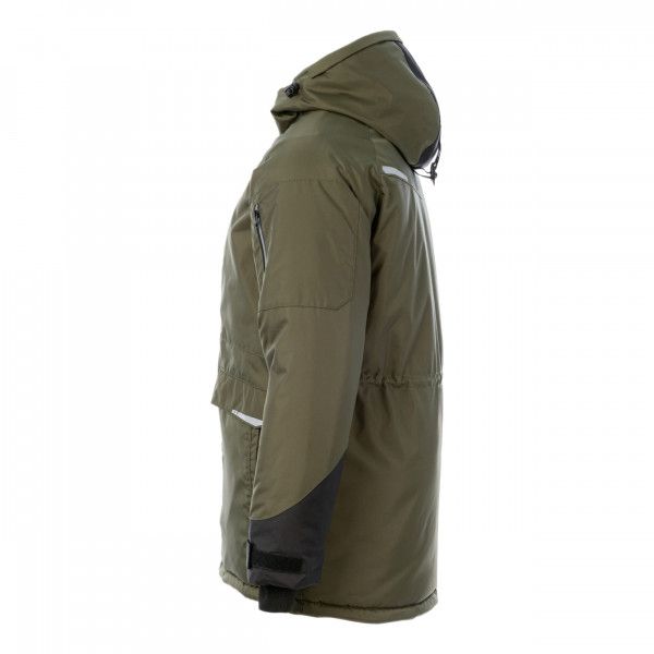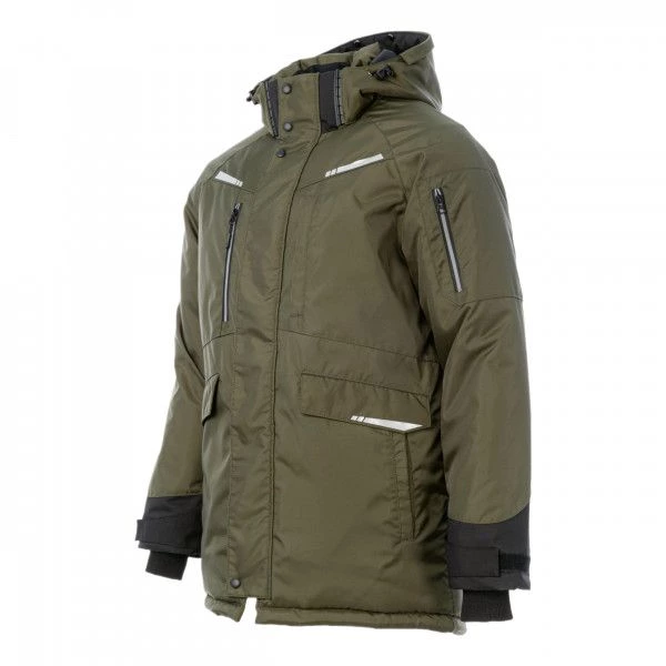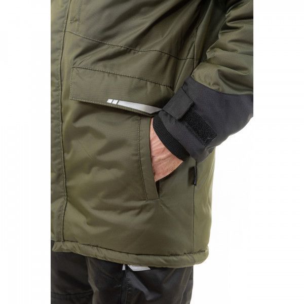Куртка застёгивается на двухзамковую тракторную молнию с ветрозащитной планкой на липучках и кнопках. Удлинённая спинка и тёплые манжеты не позволят пробраться холоду внутрь. Низ куртки утягивается эластичным шнуром с фиксатором, что также помогает сохранению тепла.