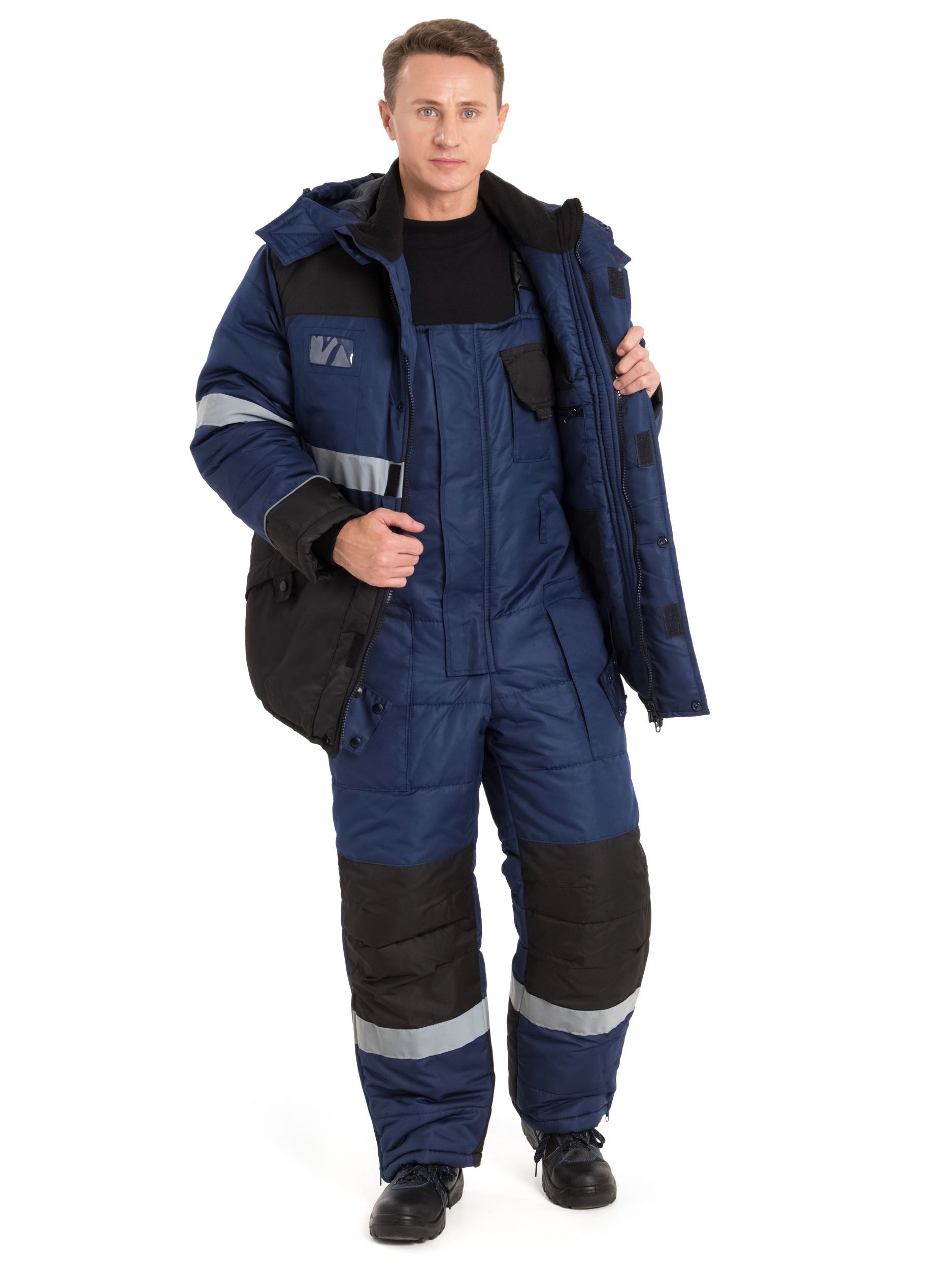 Куртка прямого силуэта с центральной застёжкой на молнии. Два вместительных нагрудных накладных кармана, один с клапаном на контактной ленте, другой на молнии и отделом для средства связи, с клапаном. Световозвращающие полосы, шириной 50 мм, проходящие по центральной части куртки и низу полукомбинезона позволяют использовать данную модель в условиях плохой видимости. Внизу куртки расположены два кармана на молниях сверху, имеющие также изолированные боковые входы. На рукаве есть дополнительный карман с отделами. В области локтей имеются усиления. Полукомбинезон со спинкой, на регулируемых лямках. Имеет центральный карман на молнии, накладной карман с дополнительным отделом для средства связи, два вместительных кармана с верхним входом на молнии. Выше колен расположены дополнительные карманы с клапанами на контактной ленте. Сзади имеется два вместительных кармана с клапанами. В области коленей и низа комбинезона имеются усиления. Комбинезон по линии талии - на резинке, объём в поясе регулируется при помощи пуговиц.