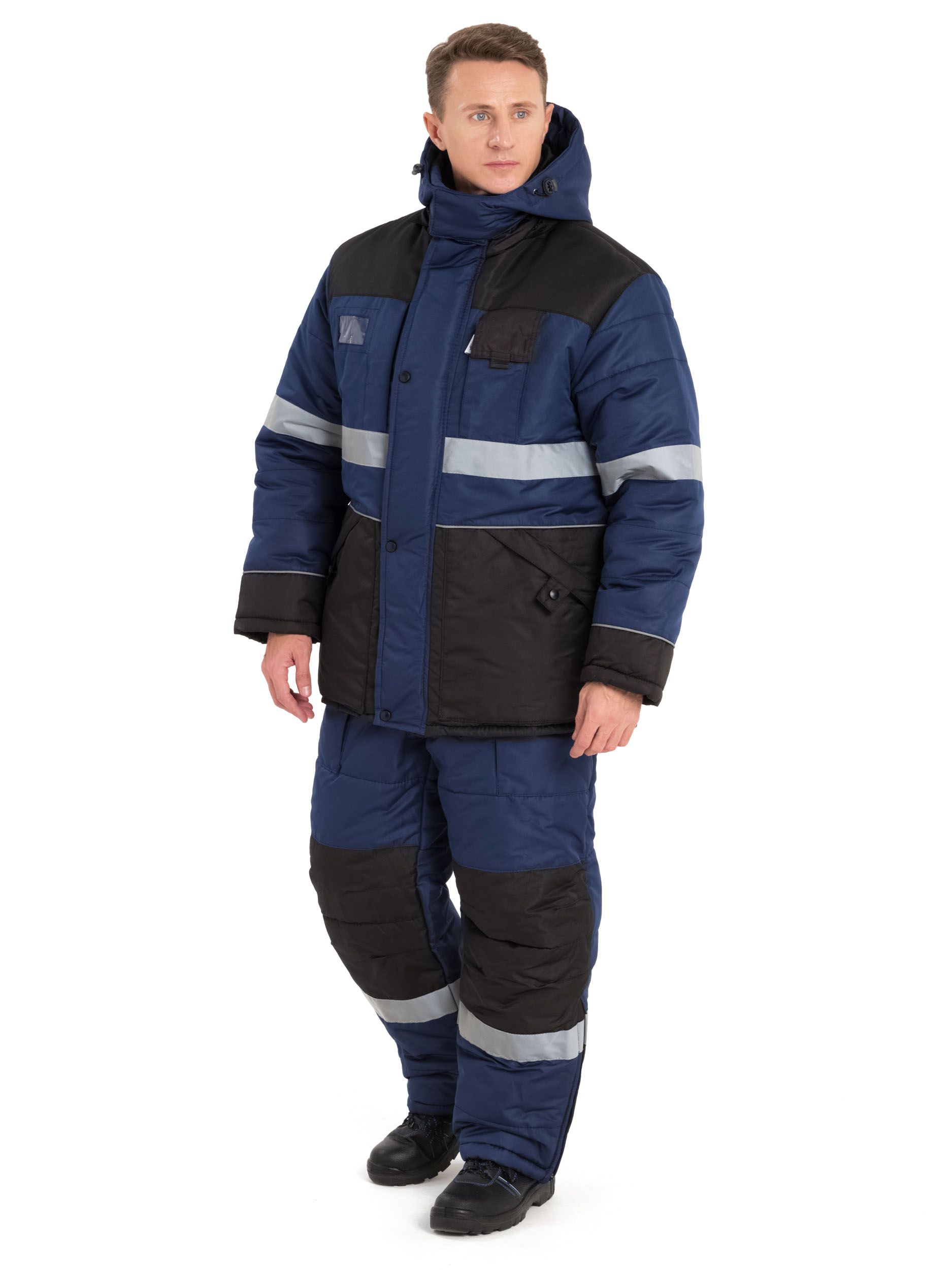Куртка прямого силуэта с воротником-стойкой, с центральной застёжкой на молнию и ветрозащитный клапан застёгивающийся на две потайные кнопки. Два нагрудных и два боковых кармана. Верхний левый карман накладной с дополнительным накладным отделом для карандаша. Верхний правый карман накладной с застёжкой - “молнией”. Нижние боковые карманы вертикальные с застёжкой на молнию. Брюки с центральной застежкой на молнию с резинкой по боковым сторонам пояса. Пояс со шлевками. Функциональные карманы по бокам. Усилительные объемные наколенники из ткани ТАСЛАН предохраняют от протирания.