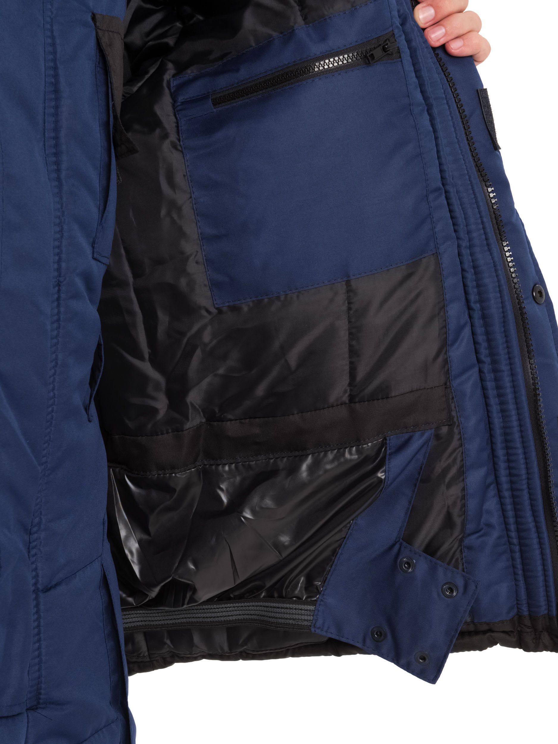 Воротник стойка, с внутренней стороны флис, съемный утепленный капюшон.