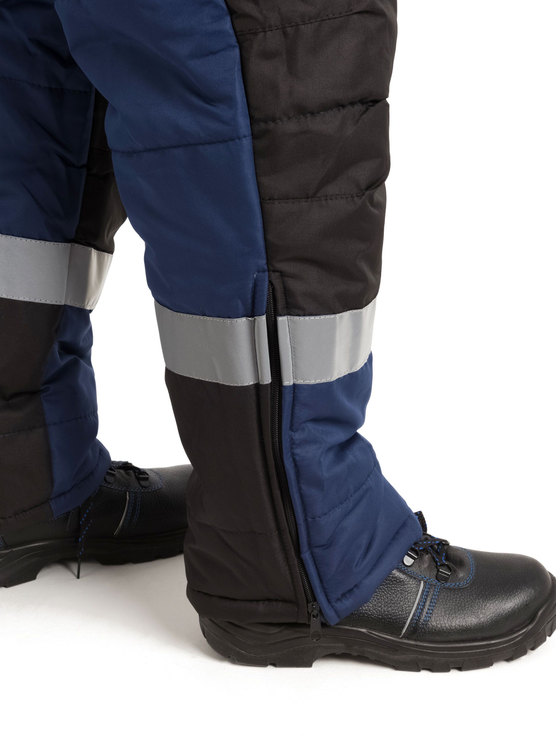 Полукомбинезон со светоотражающими полосами, с центральной застежкой на молнию и планку на текстильную застежку, на регулируемых по длине бретелях.
