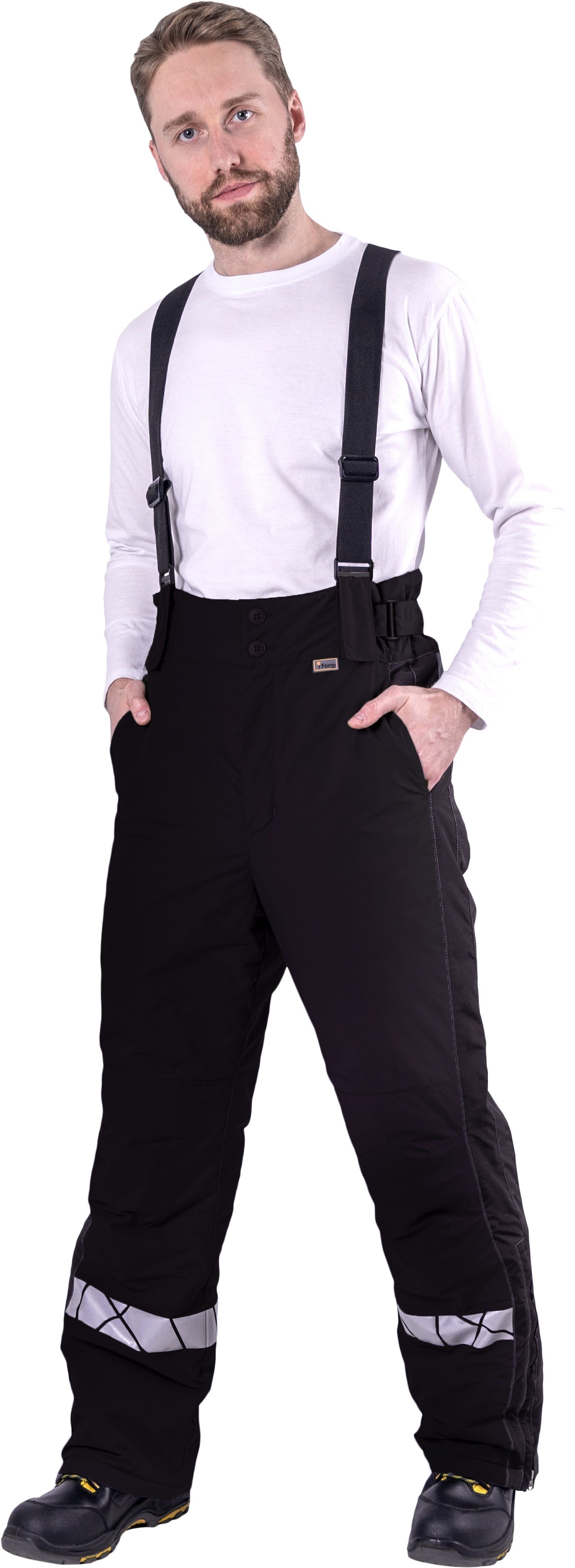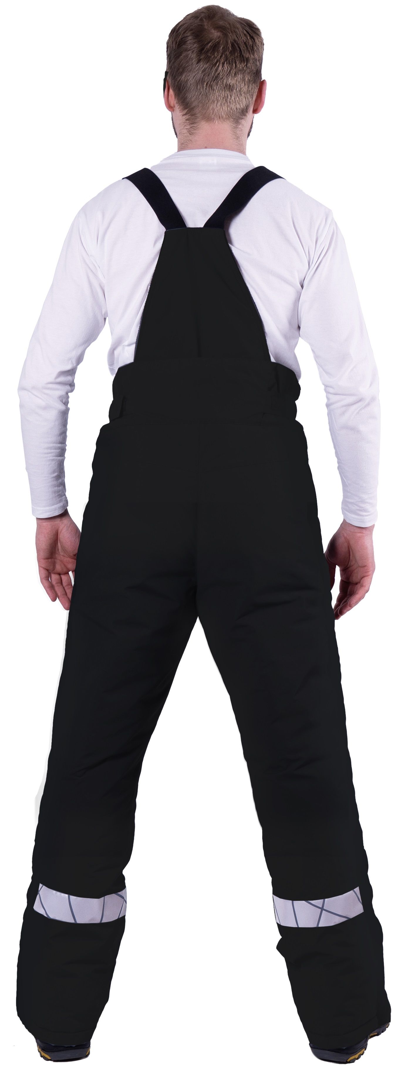 Куртка: четыре кармана для инструментов, отложной воротник, притачной пояс стянут по бокам эластичной тесьмой, по кокетке спинки, полочки и низу брюк - лента СОП 50 мм. Полукомбинезон: передняя застежка на пуговицы, застежка в боковом шве на пуговицы, бретели с фастексами, накладные карманы, по низу световозвращающая полоса СОП 50 мм.