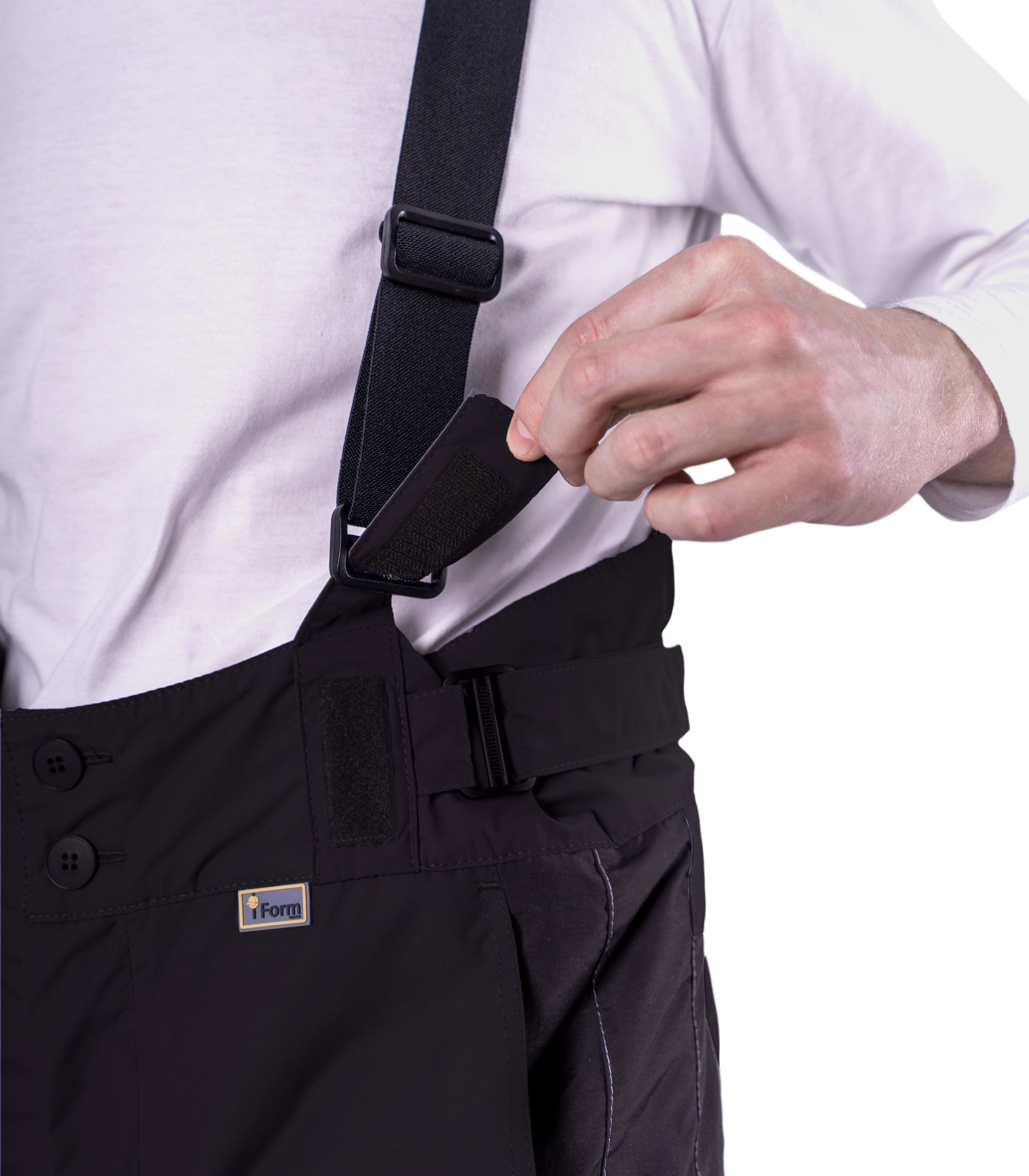 • высокий утеплённый пояс с застёжкой на две пуговицы. Объем пояса регулируется в области боковых швов с помощью хлястиков с застежкой текстильной и держателя с двухщелевой пряжкой