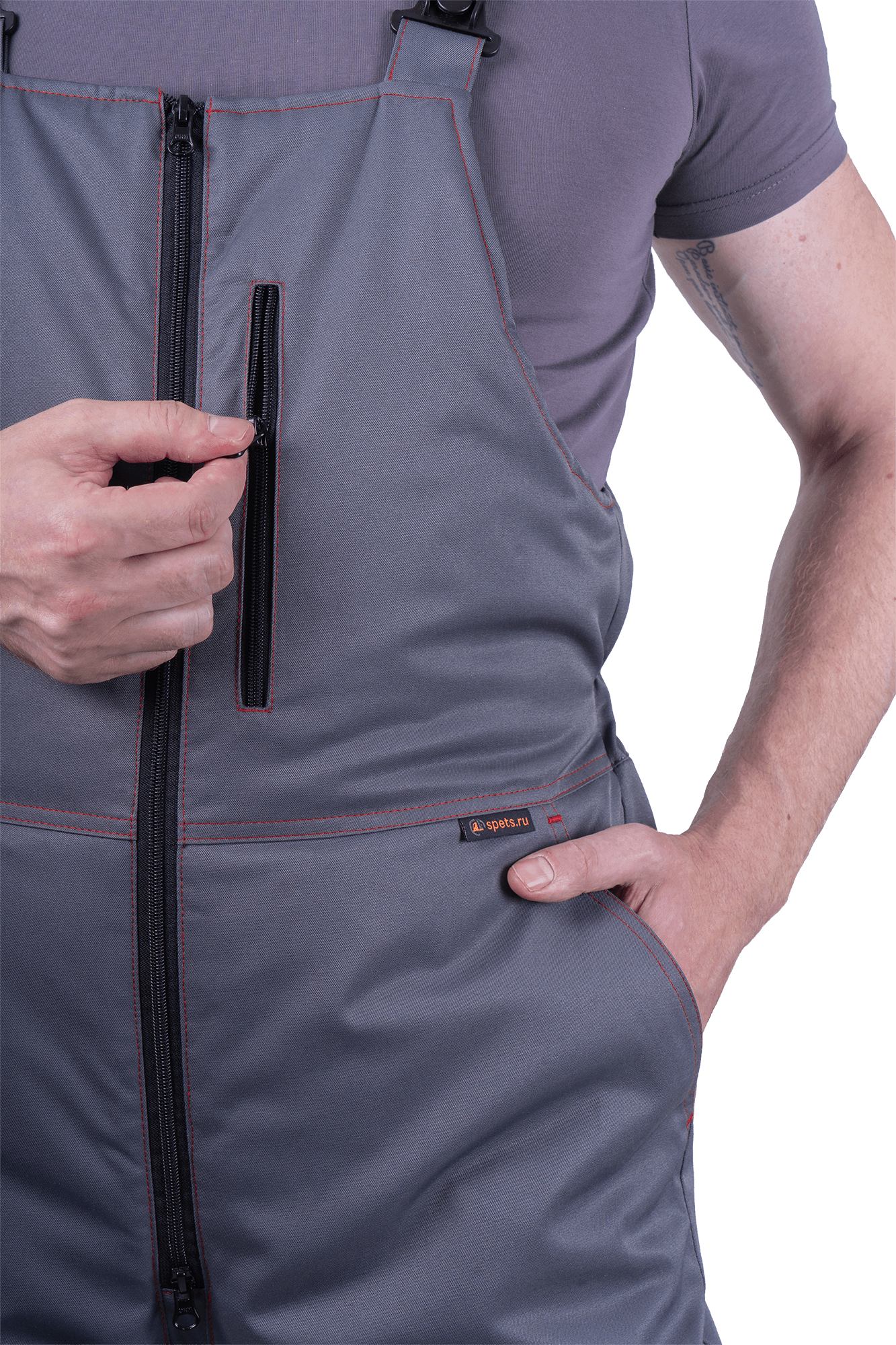 Куртка: четыре кармана для инструментов, отложной воротник, притачной пояс стянут по бокам эластичной тесьмой, по кокетке спинки, полочки и низу брюк - лента СОП 50 мм. Полукомбинезон: передняя застежка на пуговицы, застежка в боковом шве на пуговицы, бретели с фастексами, накладные карманы, по низу световозвращающая полоса СОП 50 мм.