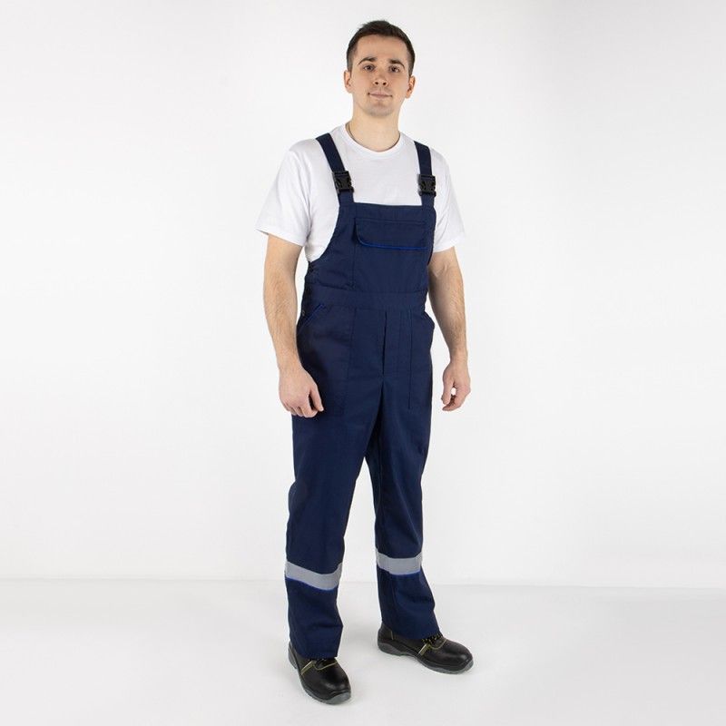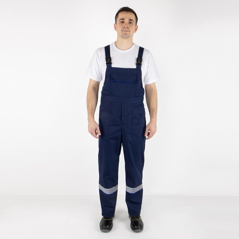 Передняя часть полукомбинезона оснащена боковыми и нагрудным карманами с клапаном, задняя часть — двойным карманом для инструментов у правого бокового шва на уровне колена.